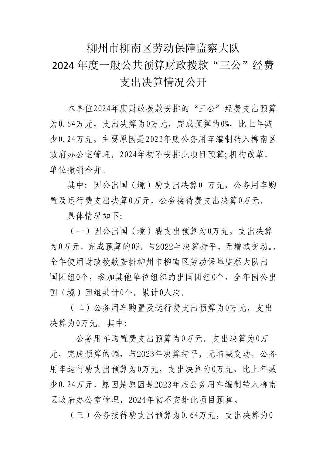 柳州市柳南區(qū)勞動(dòng)保障監(jiān)察大隊(duì)2024年度一般公共預(yù)算財(cái)政撥款“三公”經(jīng)費(fèi)支出決算情況公開